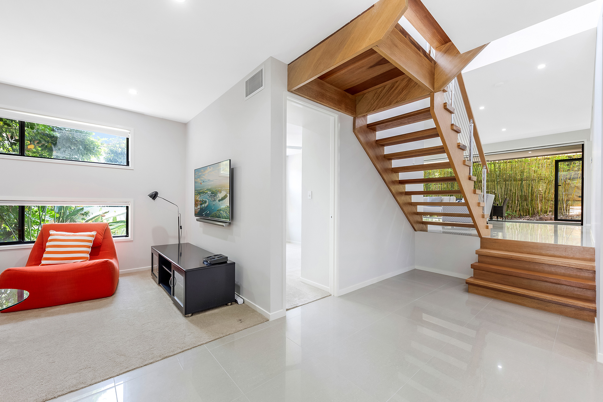 - Open plan contemporary kitchen with marble island bench, 5 burner gas stove, dishwasher, large butlers' pantry - First level private whole floor master bedroom with en-suite and large walk-in hallway wardrobe - Two large quality finished bathrooms and stunning en-suite - Large formal and informal lounge and dining rooms - Floating timber staircase across all split levels - Ducted zoned reverse cycle A/C system and ceiling fans throughout - Security alarm system - Well manicured luscious green gardens and lawn - Double automatic garage plus garage door for golf cart (golf can be enjoyed at either the famous Pines or Palms courses) - Secure gated community estate with 24 hours security